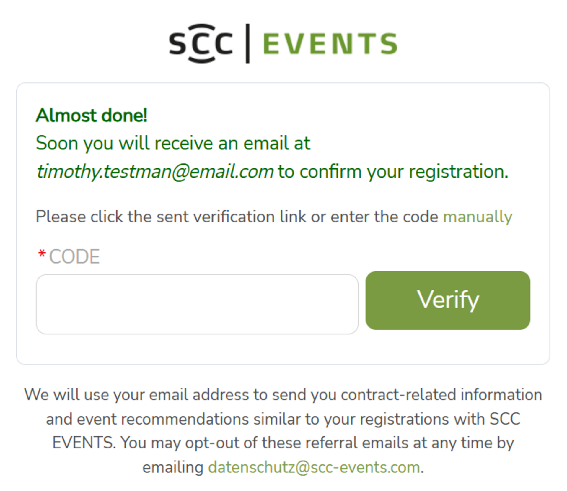 - Alternatively, you can manually enter the confirmation code contained in the email into your newly created user account. To do this, simply click on the sentence “Please click the sent verification link or enter the code manually” below the success message “Almost done!”. An input field titled “Code” will open. Enter the code from the email here and click on the button labeled “Verify.”