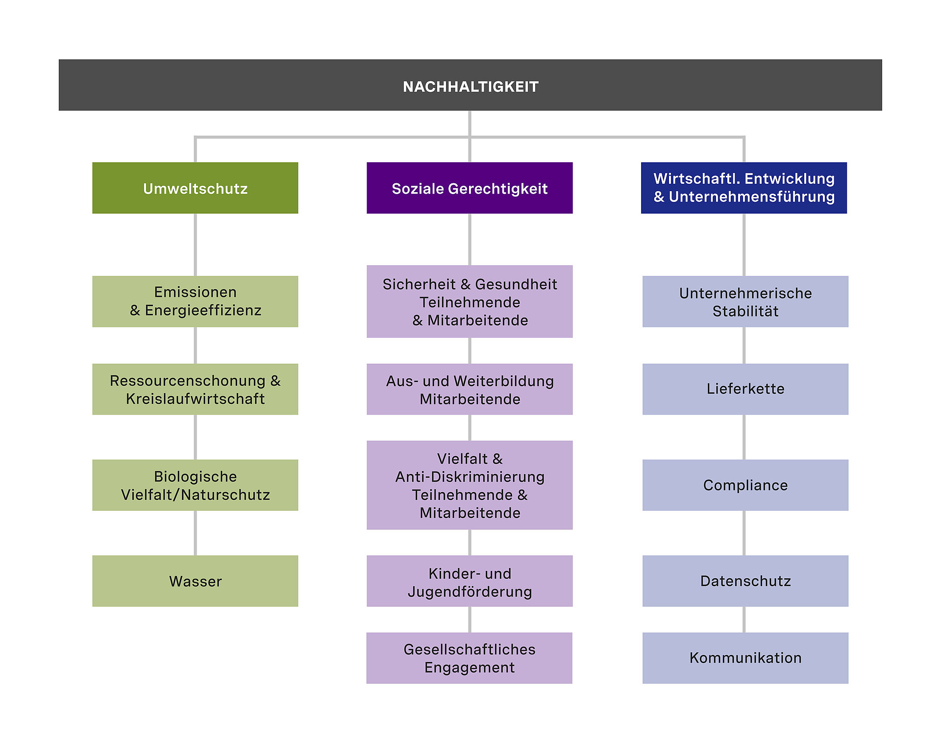 Über den Säulen verläuft über die gesamte Breite des Bilds eine graue, rechteckige Box mit der Beschriftung „Nachhaltigkeit”, die das Diagramm betitelt. Die einzelnen Kästen der Säulen sind jeweils durch eine dünne Linie miteinander verbunden, die sich durch die gesamte Säule zieht und in dieser Titel-Kachel endet. Dadurch wird symbolisiert, dass alle aufgelisteten Ziele ein Teil des Themenkomplexes „Nachhaltigkeit” sind.